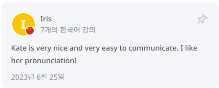 케이트 선생님은 정말 친절하시고 의사소통도 아주 편해요. 발음도 참 듣기 좋아서 마음에 들어요!