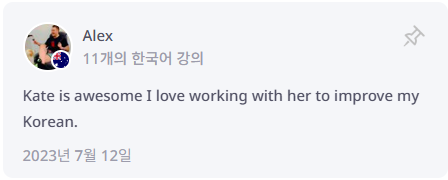 케이트 선생님은 정말 최고예요! 함께 한국어를 공부하는 시간이 늘 즐겁고, 실력이 늘고 있다는 느낌이 들어서 정말 좋아요.
