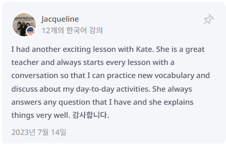 I had another exciting lesson with Kate. She is a great teacher and always starts every lesson with a conversation so that I can practice new vocabulary and discuss about my day-to-day activities. She always answers any question that I have and she explains things very well. 감사합니다.